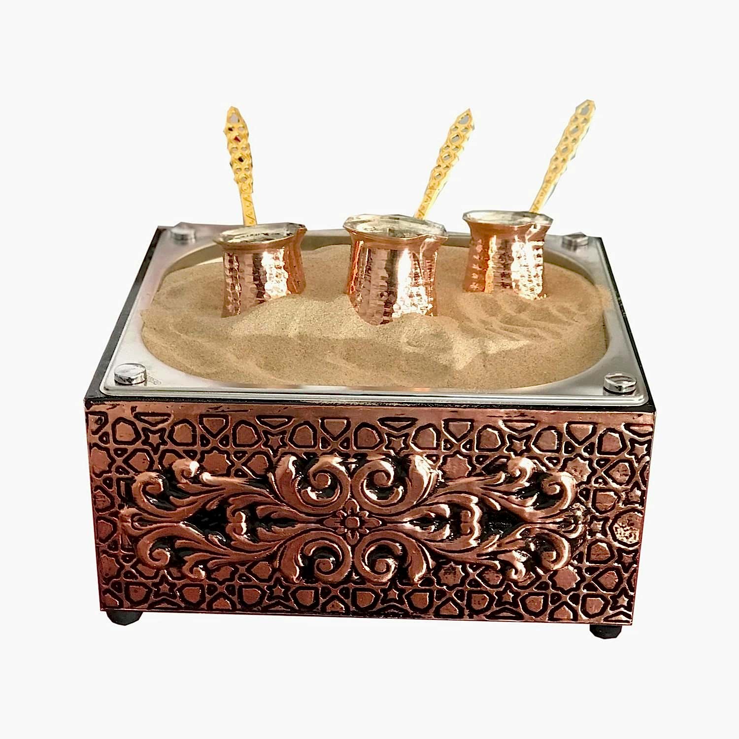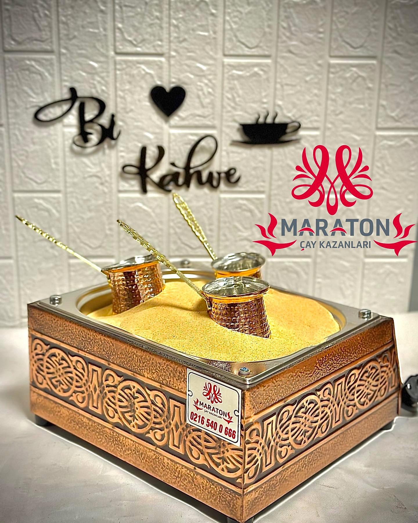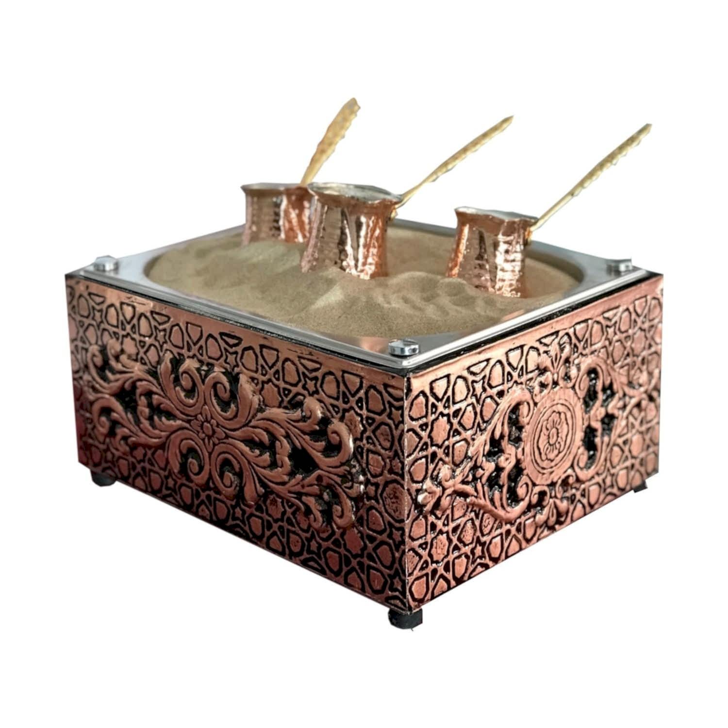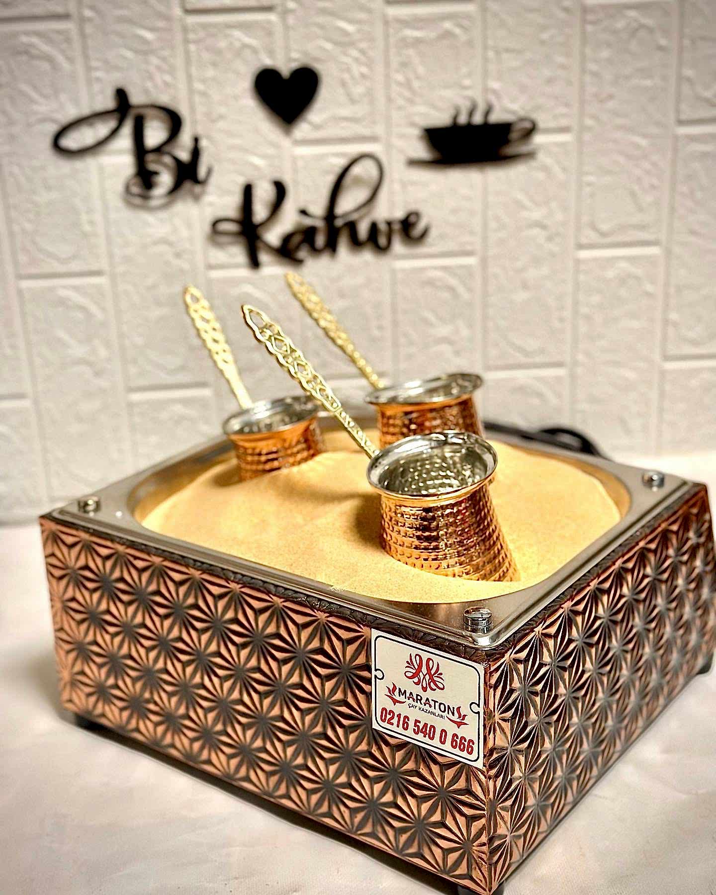 Kumda kahve makinesi elektrikli olup bakır işlemelidir.Ürün paketi 3 bakır cezve bir adet bakır işlemeli kumda kahve ve yedekli kumda kahve kumu ile gönderilmektedir.