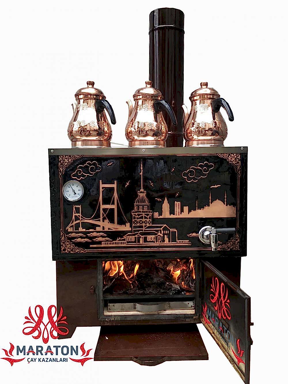 Ürün özel olarak üretilmiştir.Alt soba bölümü taşlar ile döşelidir.Taşlar ısıyı hakim kılar ve ürün sürekli sıcak kalacaktır.Çay kazanı içi ve dışı bakır olarak üretilmekte olup 5yıl delinmeye karşı garantilidir.Diğer bakır çay kazanları’ndan farklı olarak 2 kat kalınlıkta bakır ile üretilmektedir.